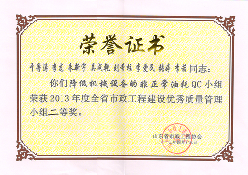 “降低機械設(shè)備的非正常油耗”QC小組榮獲2013年度全省市政工程建設(shè)優(yōu)秀質(zhì)量管理小組二等獎