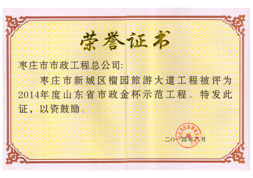 “棗莊市新城區(qū)榴園旅游大道工程”被評(píng)為2014年度山東省市政金杯示范工程